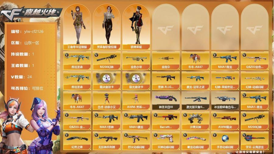 284-【商品标题】:山东一区-24V-1王者-0炫金 【传说武器】:传说圣谕 【热门武器】:传说圣谕,QBZ03-金色蔷薇,M4A1-青龙,M200-幻神,金色小号,牛牛-AK47,金刚伞 【音效卡】:Barrett-极光音效卡,AWM-裁决音效卡 【稀有皮肤】:M200-幻神-荣耀世冠白鲨,幻神-动感闪耀 皮肤,雷神-R.LGD-CFPLS18冠军,黑龙-冠军之武 【角色】:王者零-华冠丽服,灵狐者-职业经理,铁骑荣耀 【人偶武器】:白虎-迷你小艾,AWM-灵狐-15周年嘉年华,牛牛-AK47 【挑战大师】:神圣爆裂者-末日III,激光毁灭者III-白马银枪,冰龙粉碎者-白马银枪 【英雄级武器】:幻灵之锋,烈火-动感闪耀,天神-动感闪耀,屠龙-动感闪耀,手雷-动感闪耀,QBZ03-金色蔷薇,M4A1-青龙,无影-神兵利器,M4A1-雷神,M4A1-黑龙,Barrett-极光,AWM-裁决,M200-幻神,M4A1-赤狱骑士,沙鹰-天神*2,擎天-云海游龙 【特殊枪械】: